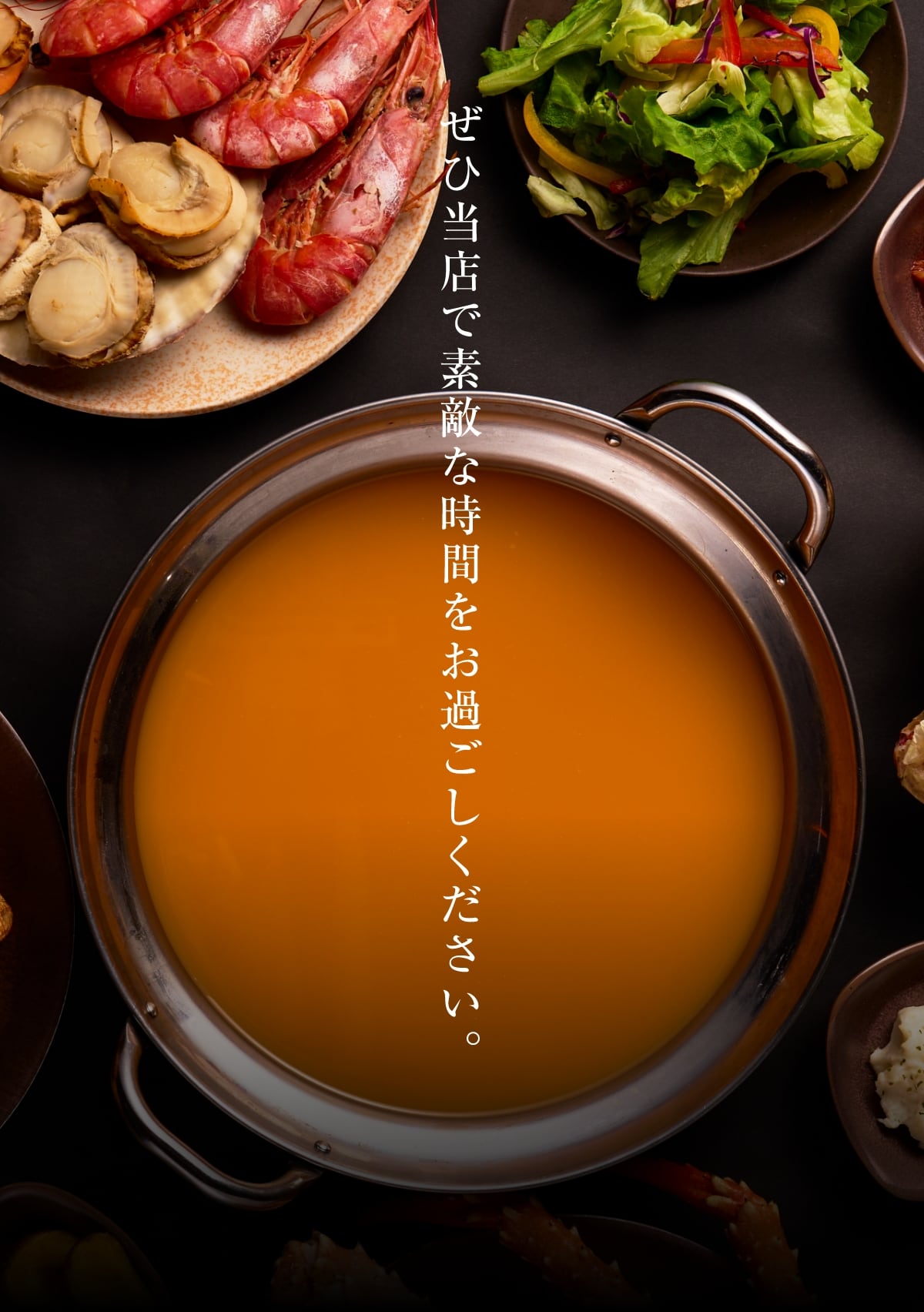 厳選和牛(北海道産)、ズワイガニ、宝冠蟹(ほうかんがに)その他、季節の魚介や名物つみれ、季節の新鮮野菜、フルーツなどのビュッフェをご用意しております。※ラストオーダーは10分前になります。 -